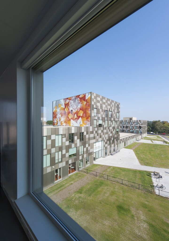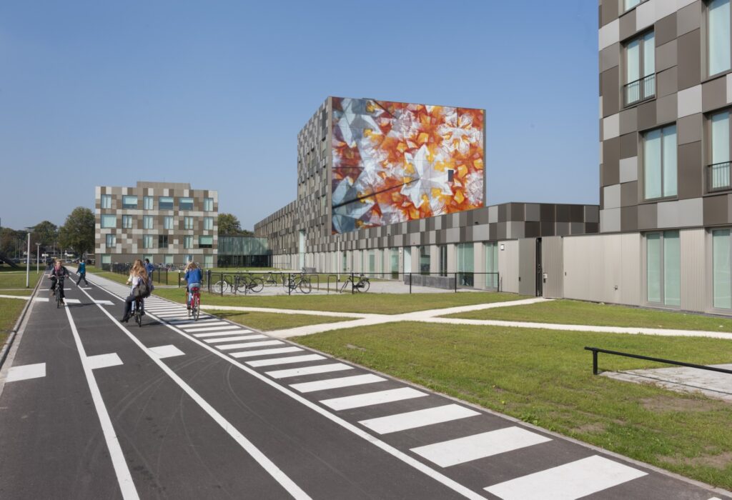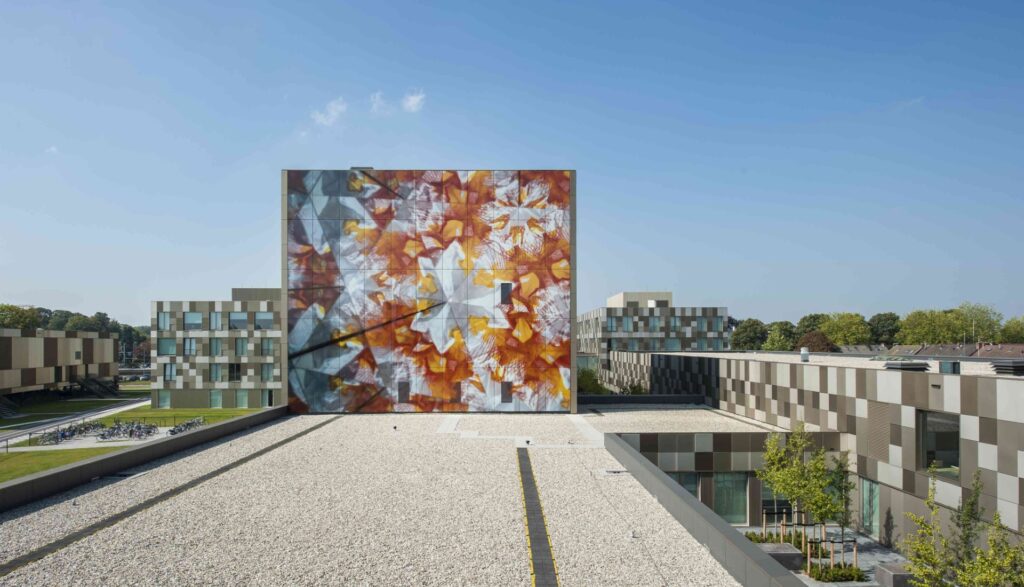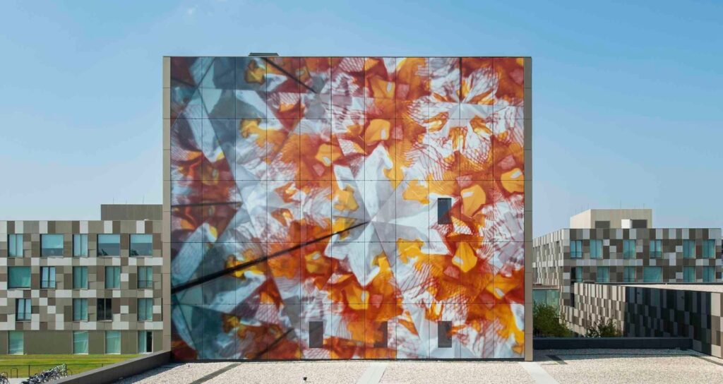 Een grote gevel vol kleur en beweging trekt direct de aandacht. De vormen lijken te draaien en te verschuiven, alsof je door een caleidoscoop kijkt. Van dichtbij zie je lagen en details, van veraf één krachtig geheel.